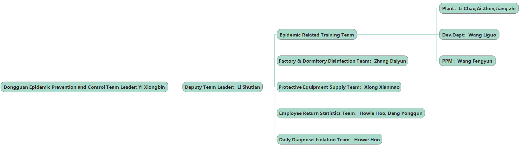 In order to ensure the prevention and control of epidemic situation and the safety of enterprise production, our company has carried out comprehensive cleaning and disinfection of workshops, dormitories and canteens for many times. For example, Dongguan company disinfects workshop 3 times a day, dormitories 4 times and dining room 5 times. We arrange corresponding disinfection before returning to work, and reserve part of the staff dormitory for emergency isolation area.